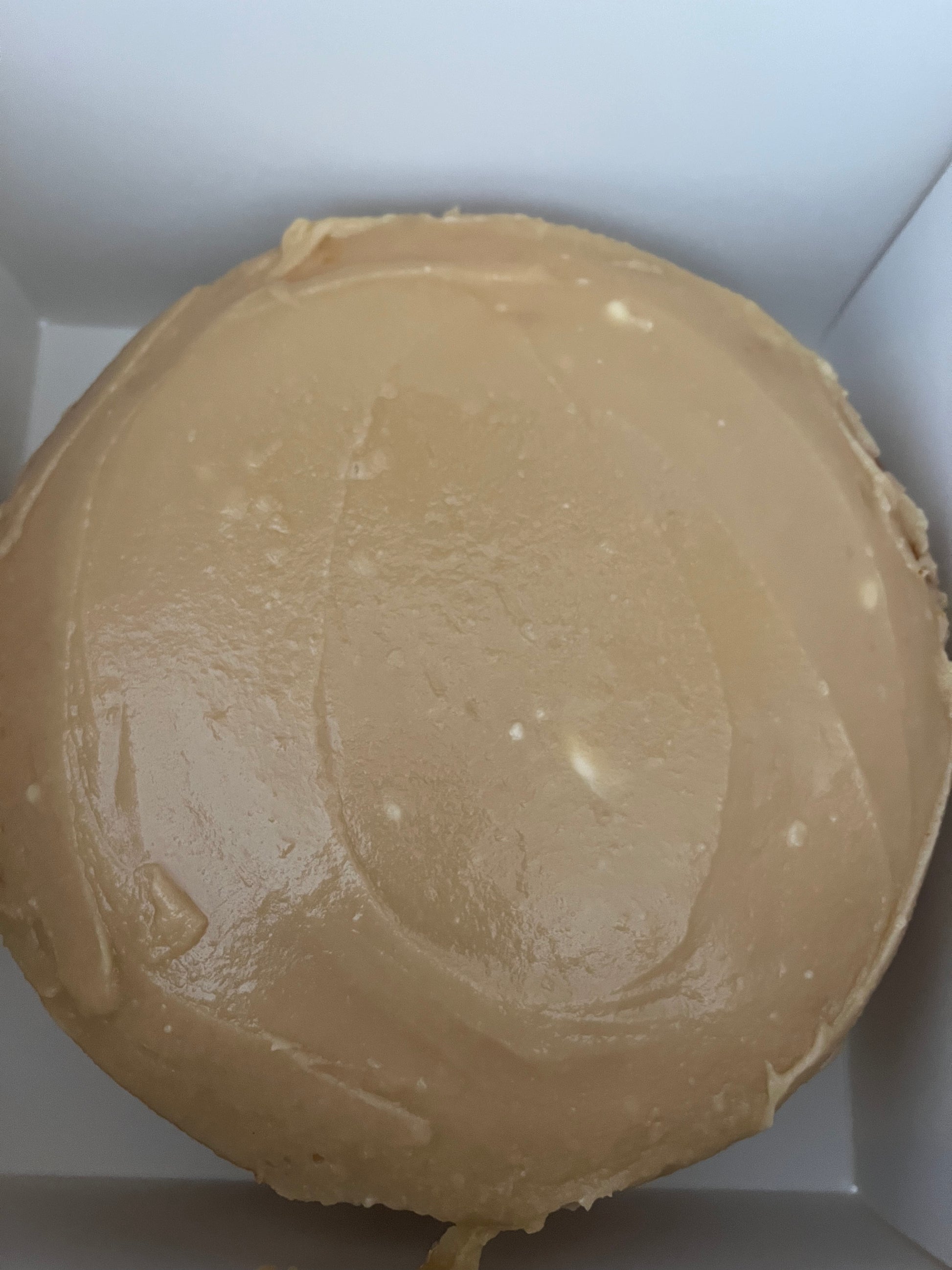 Buttery vanilla cake coated with caramel. 3 layered, 9 inch cake.