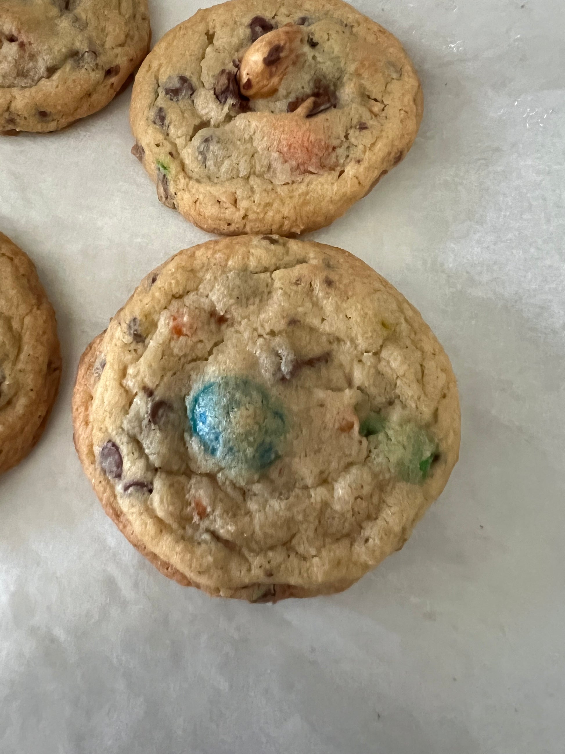 Chocolate chip cookies with peanut coated chocolate candies, walnuts, and chocolate morsels by the batch